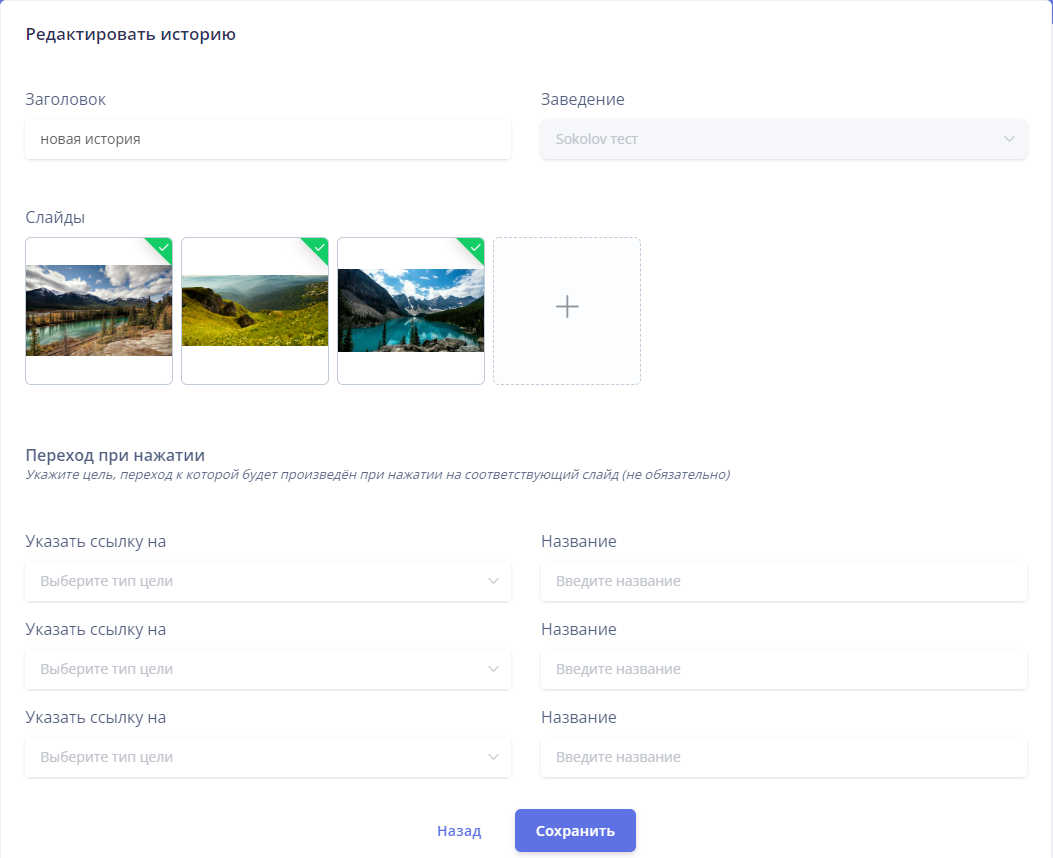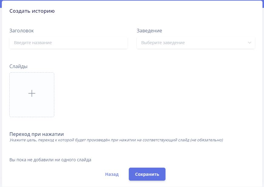 Перейдите в раздел “Истории” и нажмите кнопку “Добавить”. Перед Вами появится окно редактирования.